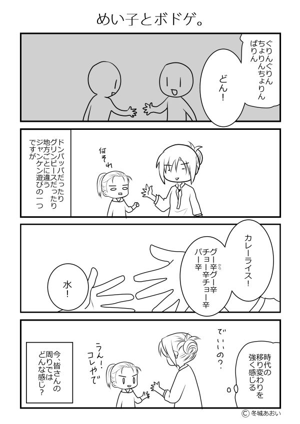 「♪ じゃんけんぽいぽい どっち出すの ♪」って皆さんご存知でしょうか? 今回は、じゃんけんに飽きてきた時にオススメのじゃんけん遊び第2弾おかしを紹介しました。 『 じゃんけんをしていき、あいこになったら先に「むし歯!」と叫んだ人の勝ちになる 』という、『グリンピース』に似たじゃんけん遊びです。 グリン ピース じゃんけんの話だし 急に自分語りしてどうした anond ここには一定数こういうのがいる。触らぬ神に祟りなし anond またお前か お前だったのか 神々の 遊び anond